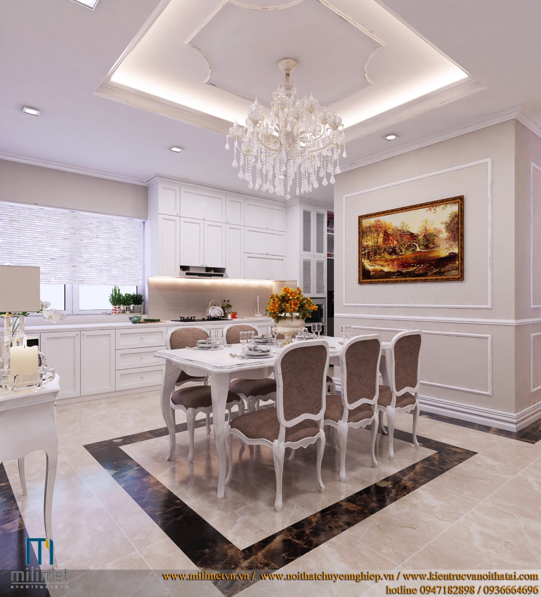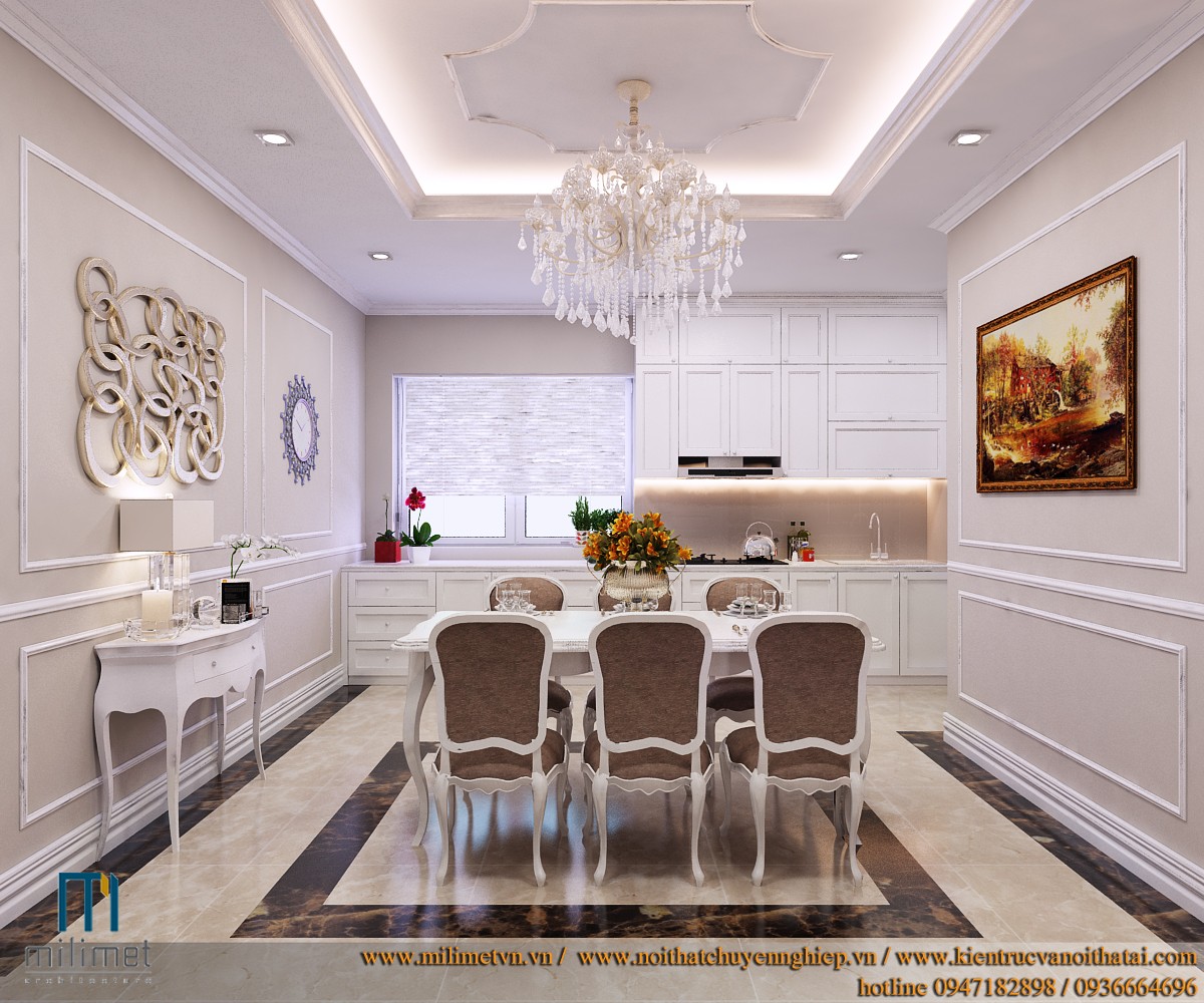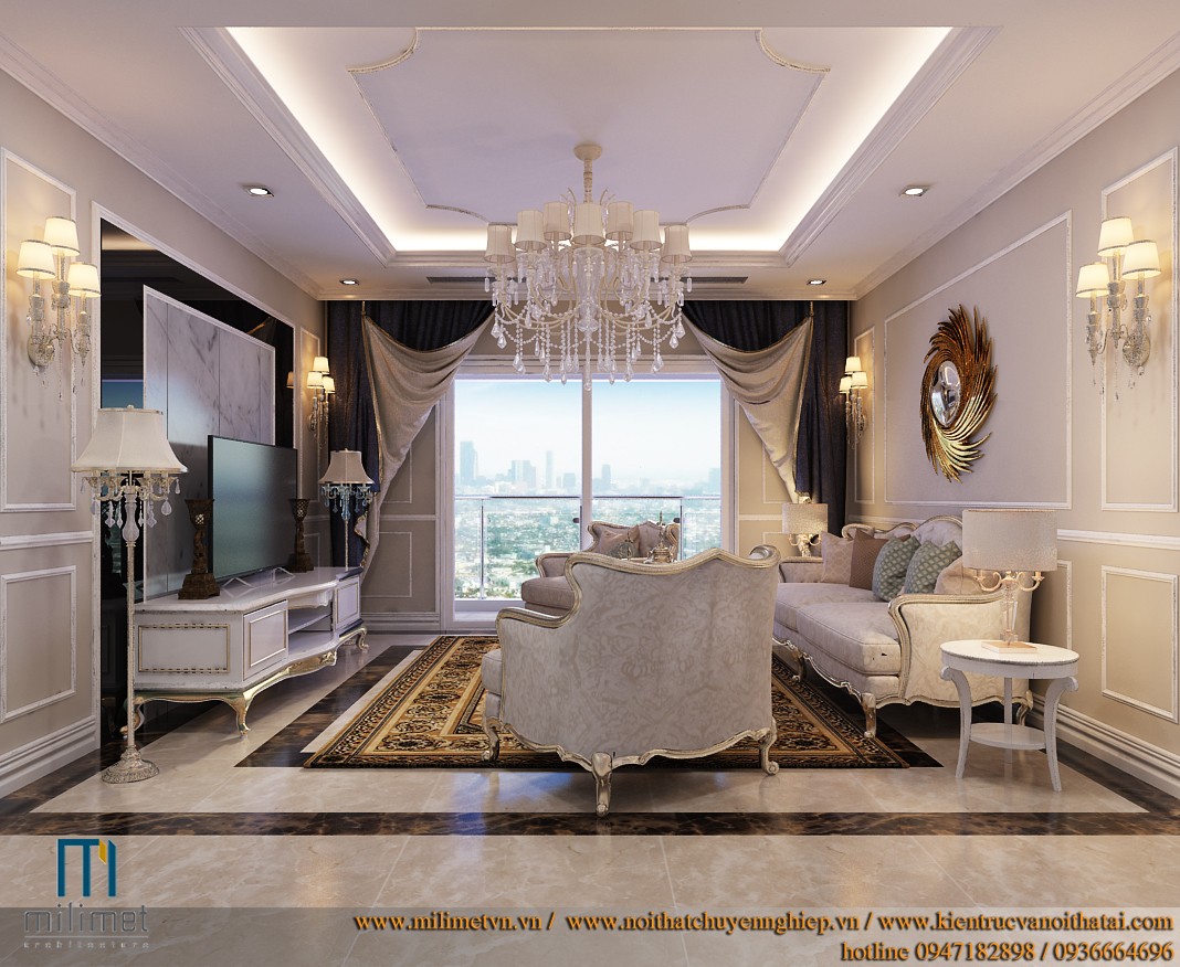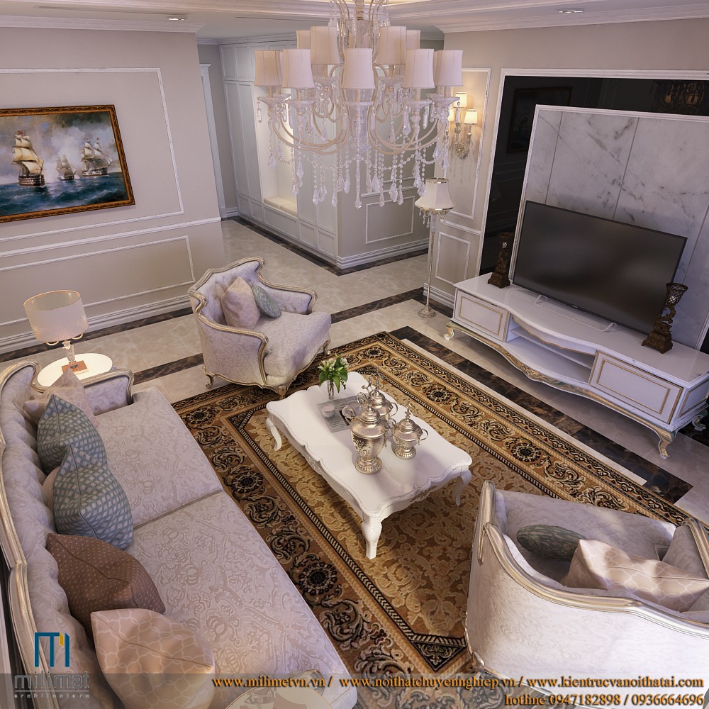 Phòng khách thiết kế với gam màu trắng sữa chủ đạo, được tô điểm thêm bởi các gam màu sống động của đồ dùng và vật dụng trang trí nội thất đẹp. Căn phòng tạo điểm nhấn bởi bộ sofa thiết kế theo phong cách Pháp, màu sắc nhẹ nhàng tạo sự sang trọng, quý phái. Trần nhà treo chiếc đèn chùm pha lê với ánh sáng lung linh, vào ban đêm căn phòng trở nên đẹp lộng lẫy hơn