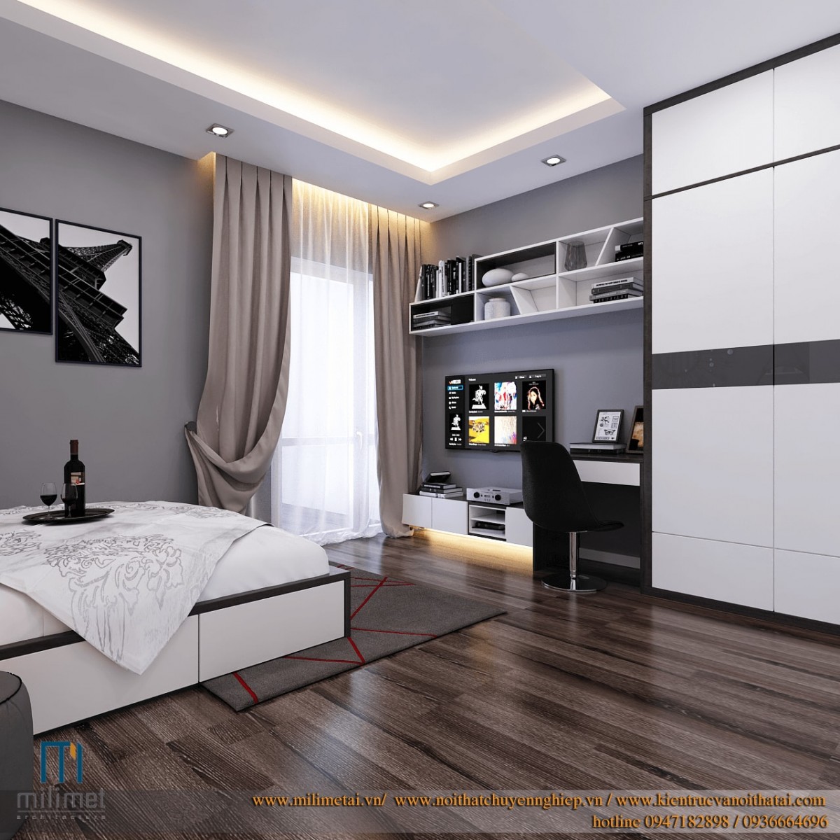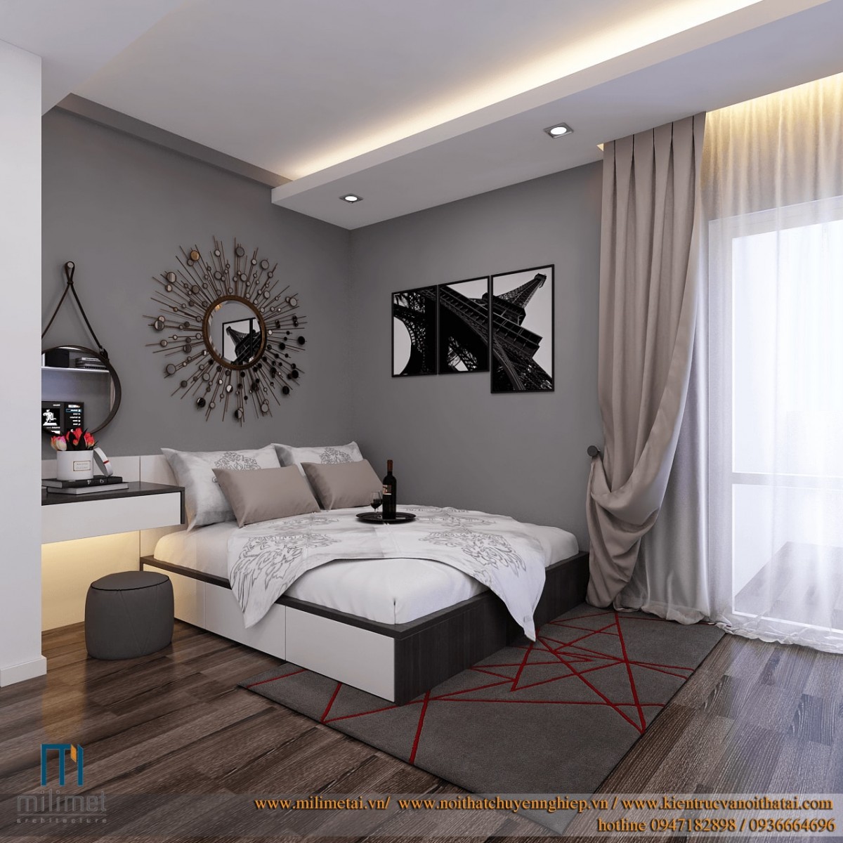 Phòng ngủ bố mẹ: Bằng sự pha trộn giữa 2 màu sáng tối MILIMET đã design 1 phòng ngủ thanh lịch, sang trọng và ấm cúng