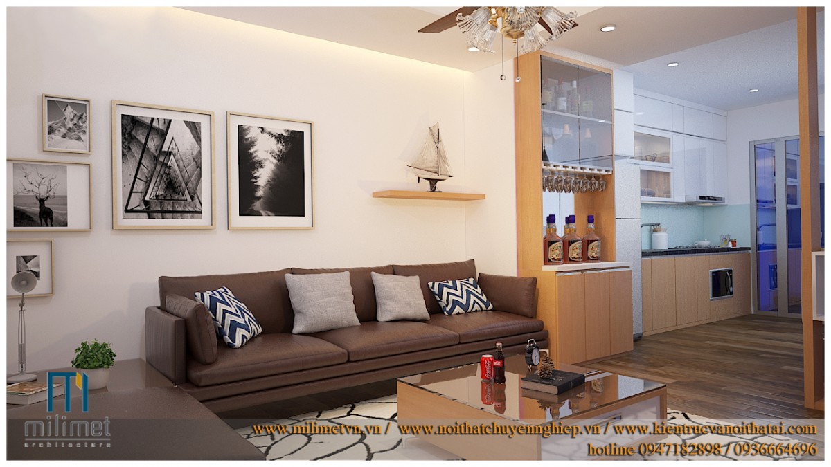 Phòng khách với phong cách hiện đại, đơn giản giúp không gian trông rộng hơn. Nan gỗ giữa phòng giúp ngăn chia không gian phòng khách và khu bếp ăn, vừa làm kệ trang trí. Đây là mẫu thiết kế chung cư đẹp lí tưởng hiện nay.