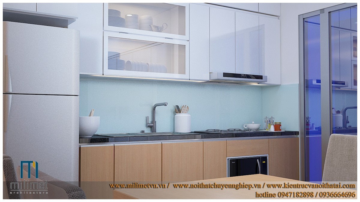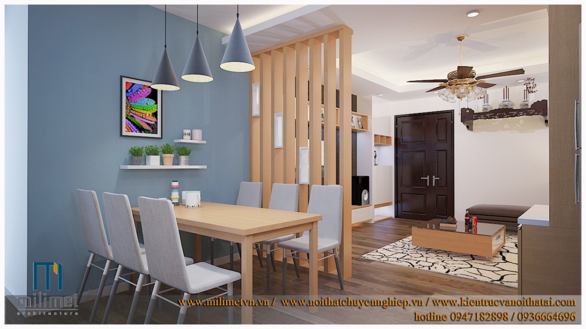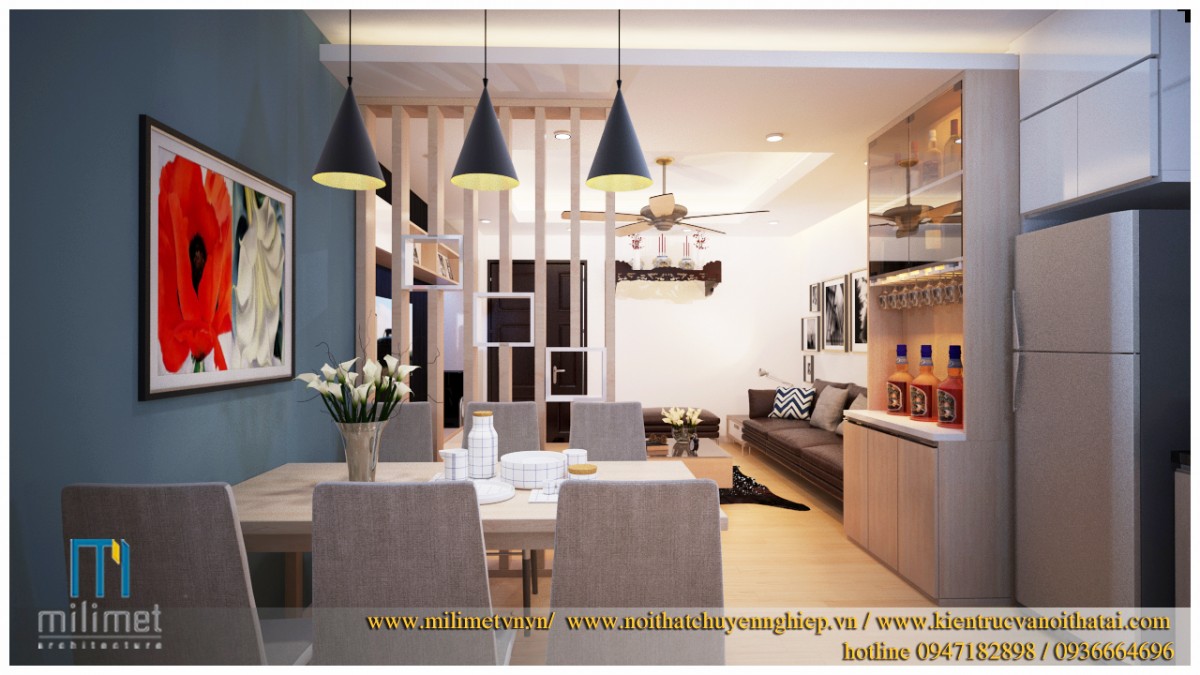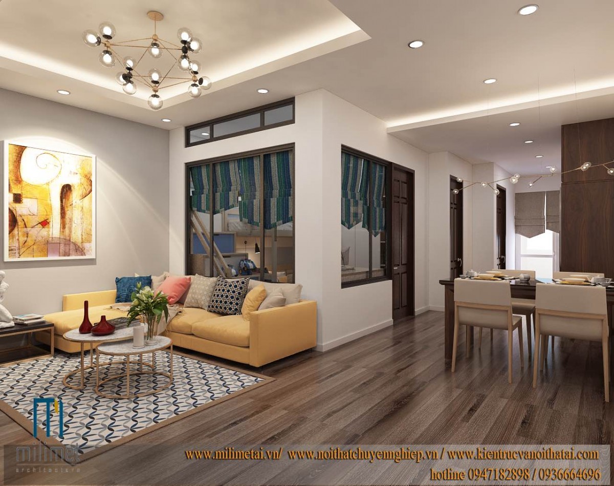 Dưới đây là hình ảnh căn hộ 60m2 nhà anh Hoan – Từ Liêm. Milimet đã đưa ra giải pháp thay mảng tường khô cứng bằng hệ thống vách kính và lùi mảng tường theo kiểu bậc thang giúp căn hộ tràn ngập ánh sáng. Kết hợp đồ nội thất mang màu sắc tươi sáng khiến căn hộ trông rộng hơn và đầy sức hấp dẫn.