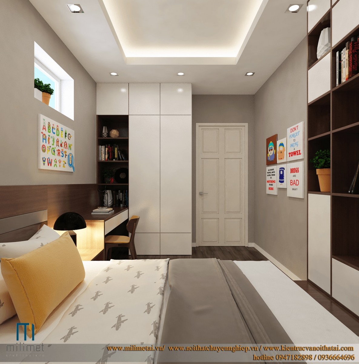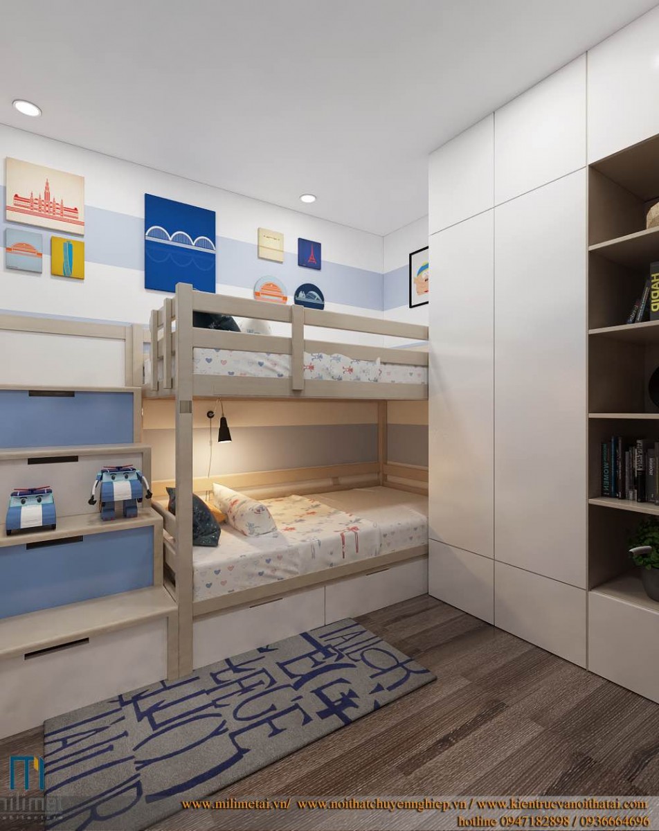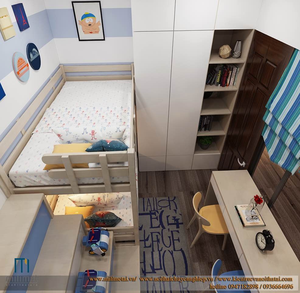 Diện tích căn phòng chỉ 10m2 cho 2 bé trai tinh nghịch và năng động, Milimet đã cố gắng đưa ra những giải pháp giúp căn phòng tuy nhỏ nhưng đầy đủ công năng. Không gian chủ đạo của căn phòng là màu xanh phù hợp với những bé trai, màu sắc kích thích sự năng động, sáng tạo cho bé. Hệ giường tầng giúp tiết kiệm diện tích , bậc cầu thang làm bằng hộc tủ giúp bé để đồ chơi. Do phòng nhỏ, tường được thay bằng hệ thống vách kính, không có không gian để treo giá sách, Milimet đã nghĩ ra giải pháp thiết kế chiếc tủ quần áo kết hợp giá sách. Hai cậu bé đã vô cùng thích thú căn phòng của mình.