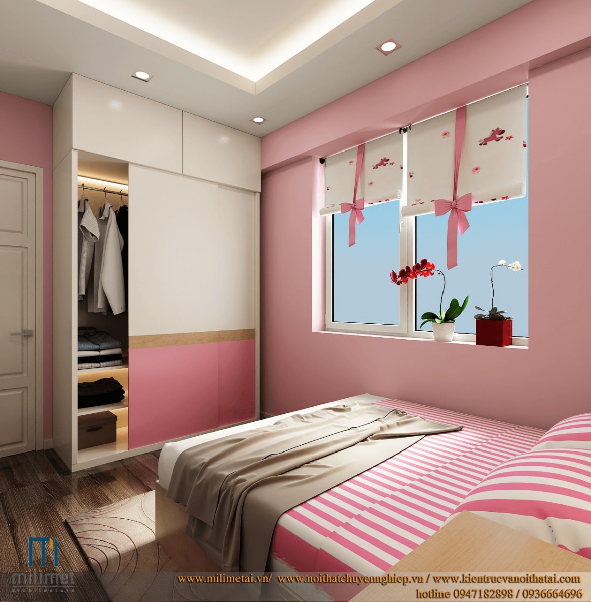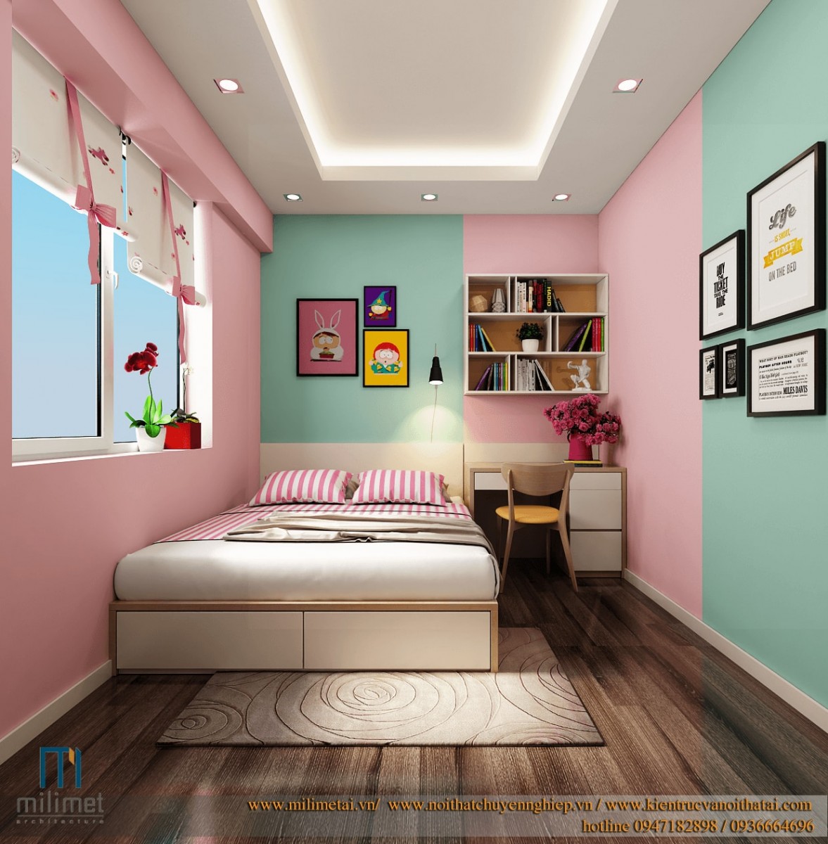 Phòng ngủ con gái: Để biến phòng ngủ dành cho bé gái thành chỗ mộng mơ ngọt ngào, sinh động, vui nhộn và dễ thương chúng tôi lấy gam màu hồng, xanh làm chủ đạo.