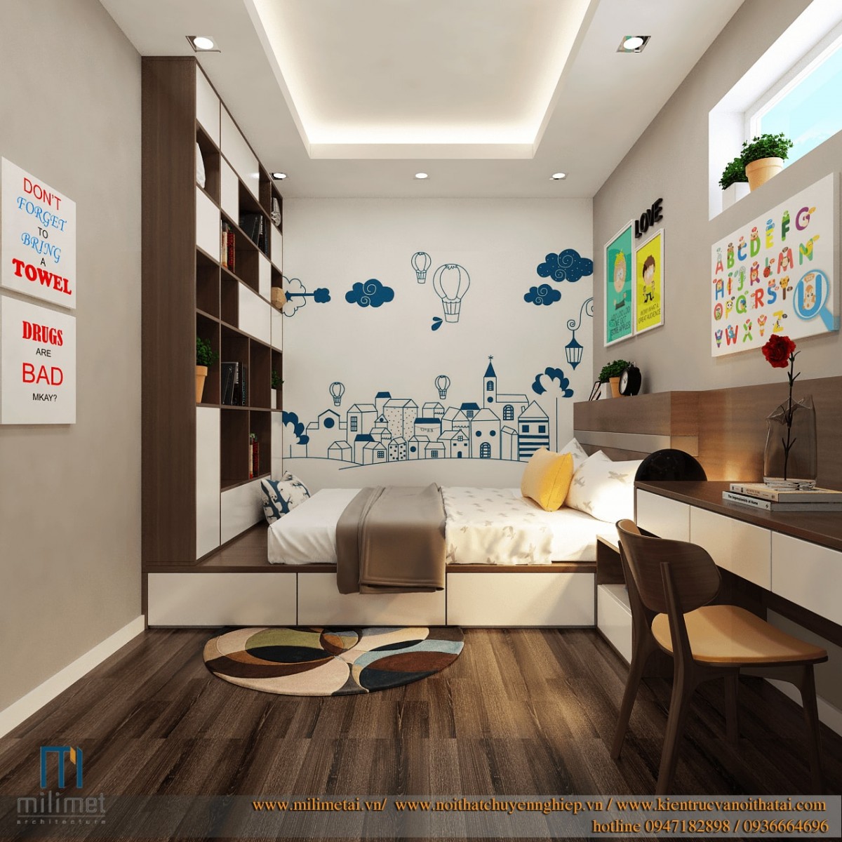 Phòng ngủ con trai: Với tiêu chí tạo mọi điều kiện vui chơi khám phá và sáng tạo cho bé nên chúng tôi đã tính toán rất kỹ từng chi tiết nhỏ nhất. Phòng ngủ chỉ 10m2 nhưng đầy đủ không gian chơi và học cho bé